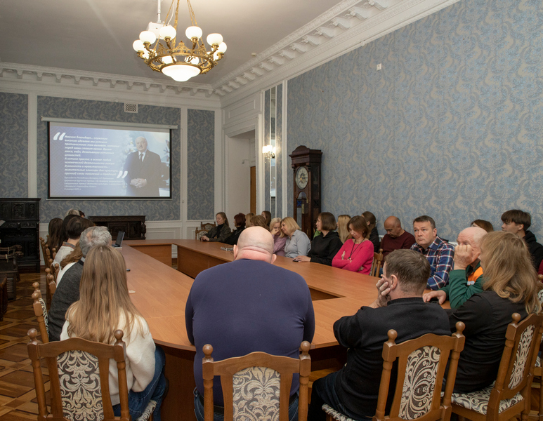 Намеснік дырэктара па навуковай рабоце А.І.Рапінчук расказала супрацоўнікам музея аб дзяржаўнай падтрымцы сем’яў, мерапрыемствах па ўмацаванні сямейных каштоўнасцей, якія праводзяцца ў Беларусі, і комплексе мер для падтрымкі сем’яў, якія выхоўваюць дзяцей, з асаблівым акцэнтам на шматдзетныя сем’і.